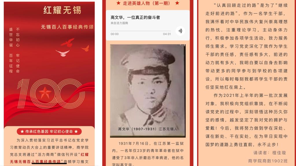 为深入贯彻落实习近平总书记在党史学习教育动员大会上的重要讲话精神,商学院党总支通过“活力国商”微信刊开设“红耀无锡—无锡百人百事经典传颂”专题活动。通过解读和展示中国共产党百年发展历程中的“无锡元素”和“红色基因”,力求讲好无锡故事,传播无锡声音,传承红色信仰,推进砥砺前行。