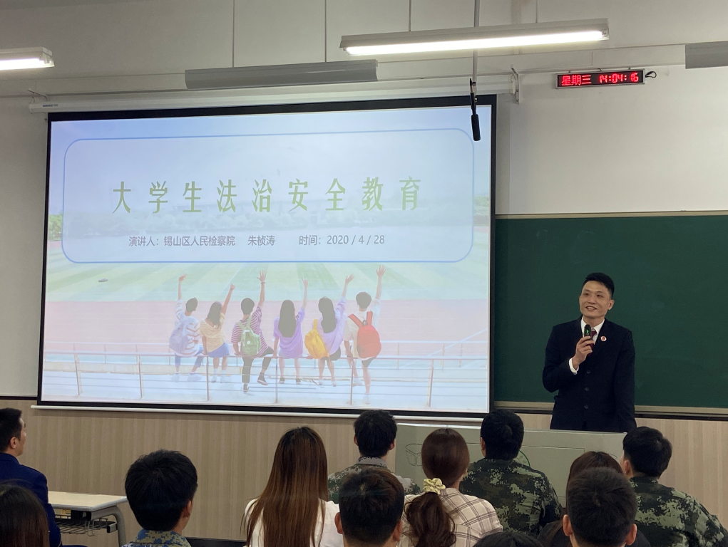 在喜迎中国共产党成立100周年之际,为了创建和谐、平安的校园,切实保障学生的人身安全,提高学生自我保护能力,增强学生的法治观念、提高法治意识。4月28日下午1:30,商学院于C楼107教室开展了2021春季法治安全教育讲座活动。讲座邀请了无锡市锡山区人民检察院工作2016届优秀校友朱桢涛做校园法治安全讲座。学院党总支副书记杨玲燕、辅导员王琪老师、商学院退伍老兵代表、各班舆情员、心理委员、生活委员90多人聆听讲座。