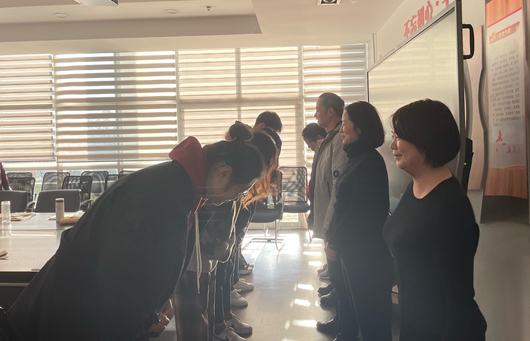 最后蒋院长对五位新教师这一年以来的教学成绩给予肯定,对在场指导老师的耐心指导表示感谢,呼吁新教师们当场郑重地向指导老师行“拜师礼”,感谢他们的悉心培养。当前学校迎来新时期的发展机遇,她也希望各位新老教师青蓝相继、薪火相传;明确发展目标、找准奋斗方向、勇做先进人、勇挑先锋担;在“教真、学真、练真”的课堂中落实三全育人。