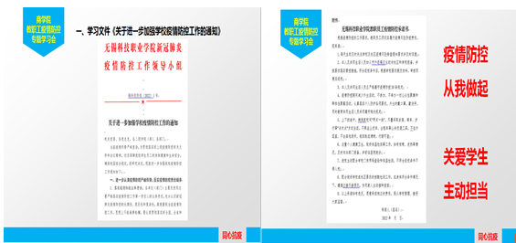 教师代表就近期防控工作做交流发言。徐颖老师带队在南京参加技能竞赛集训,表示面对突如其来的疫情积极配合地方管控要求,做好学生防控物资的采买和心理调适工作,目前一切进展顺利;曲璞玉老师作为住校辅导员,自己严格执行学校防控要求的同时,每天走访宿舍,和学生谈心交流,积极做好学生管理工作;班主任代表肖陆嘉、周晔老师交流了学生日常管理的心得体会,要做学生的贴心人,实时关心,重点关注;学生工作戴媛媛老师提出近阶段在加强常规管理的同时要注意言论的合理引导,营造积极向上的氛围;居家老师朱琰表示积极配合社区防疫要求,做好健康监测工作,同时保证学校工作不落下。