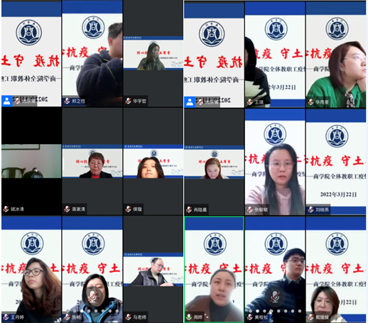 3月22日中午,商学院召开疫情防控专题学习线上会议,学习贯彻学校疫情防控工作会议精神,部署落实学校近期疫情防控工作重点和要求,商学院全体教职工参加,会议由党总支书记汤兴荷主持。