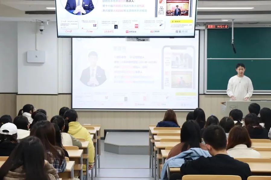2019级电商专业黄维乐在校期间担任校长助理与标本社社长,带领团队获得市级十佳优秀社团,成为第十六届共青团江苏省代表大会代表。在校期间他创立标本社,并获得挑战杯国赛金奖等多项奖项。他分享了自己如何将从小对标本的热爱到长大后的深入研究,最后创业成功的成长过程,激励大家要坚持热爱、持之以恒才能达到胜利彼岸。