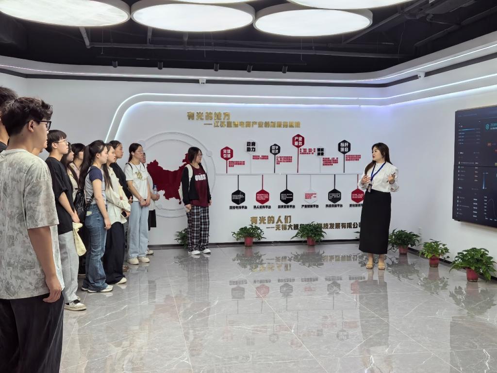 接着,同学们走进了无锡大鲤鱼文化科技发展有限公司,真实地感受了企业的工作氛围,大鲤鱼文化科技是一家以直播产业赋能为核心的综合型科技企业,拥有多平台MCN授权和丰富的网红达人资源,通过大数据可视化平台全方位地实现直播流程的系统化。公司负责人赵慧敏女士热情细致地给学生们讲解了公司是江苏直播电商产业创业服务基地,在3500平方米的工作场地内,同学们领略了供应链展厅、功能齐全风格各异的25个专业直播间和AI数字人展示运营中心。通过赵总对AI等新技术的生动介绍,同学们一边参观一边感叹着科技改变生活的巨大变化。