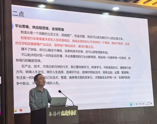 产业教授杨小军是无锡中关村科技园法人代表及总经理,曾任无锡新区财政局副局长、新发集团董事长、总经理。讲座开始,杨教授以一组中国2023年制造业产值占比达到了全球的35%位列全球第一,超过第2到第10名的总和的数据切入主题,并分别从基础产业、传统产业和新兴产业分析了中国制造强国的发展现状,以一组组耀眼的数据勾勒出中国制造的全球地位。谈及中国制造业的发展及新趋势,杨教授分别从中国为什么能成为制造业大国、中国电子第一街——深圳华强,新时代中国制造业的新三样进行了深入剖析。他指出,从服装、家电、家具老三样到新能源汽车、锂电池和光伏产品新三样,中国制造业不仅规模庞大,更在产业结构上实现了从低端代工向高端智造的跨越,中国“灯塔工厂”总数已达72家,占全球42%(灯塔工厂是指在工业 4.0 背景下技术应用的最佳实践工厂,代表了全球智能制造的最高水平,代表着制造业数字化转型的趋势和新标准),在无锡就有四家企业:中信特钢无锡江阴工厂、阿斯利康、博世以及施耐德电器。讲座的最后,杨教授提了几点建议,第一,躬身入局、专注专心,工作中力求精益求精,同时要有更多的创业思维,跟上时代步伐;第二,平台思维、供应链思维、全球思维,在产业、技术、市场日新月异的今天,我们要持续学习、终身学习,不断提高自己,明确人生定位。