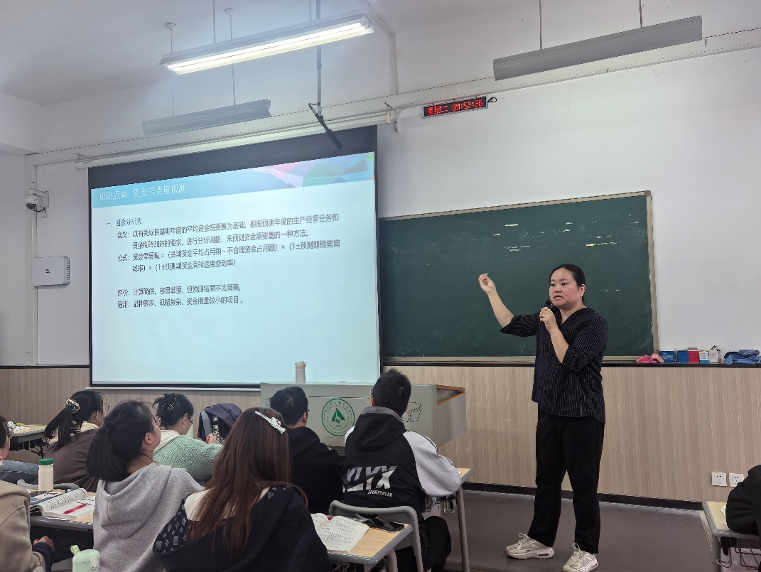 徐颖老师的《财务管理》课程围绕“资金需要量预测”展开。她系统讲解了因素分析法、销售百分比法和资金习性预测法,理论联系实际,逻辑清晰。听课教师在评课中特别指出,徐老师“上课注重思政教育,善于利用思政元素,讲课方式方法灵活、得当,与学生课堂互动氛围好”。